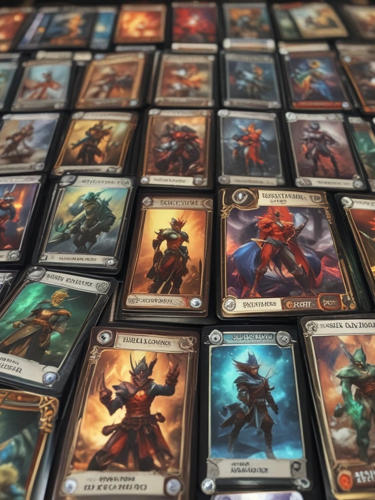 A cozy desk scene with vibrant trading cards, game boxes, and a laptop showing an online store.