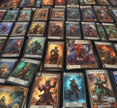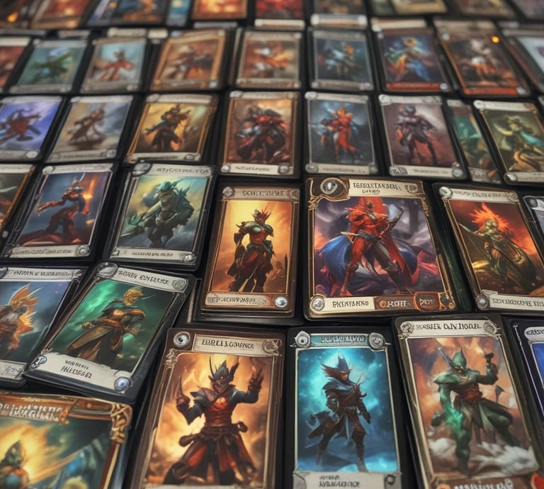 A cozy desk scene with vibrant trading cards, game boxes, and a laptop showing an online store.